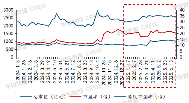 2025年上半年,港股与A股物业板块走势略有企稳,受政治局会议首次提出“房地产市场止跌回稳”的目标的影响,以及两会政策利好和消费回暖预期推动,总体上呈现稳中有升的态势。截至2025年6月24日,行业共有67家上市公司,其中香港主板61家,A股6家,上市公司总市值约为2598.21亿元,PE均值为21.18倍(剔除负值及大于500倍的异常值),均较去年同期有所回暖。