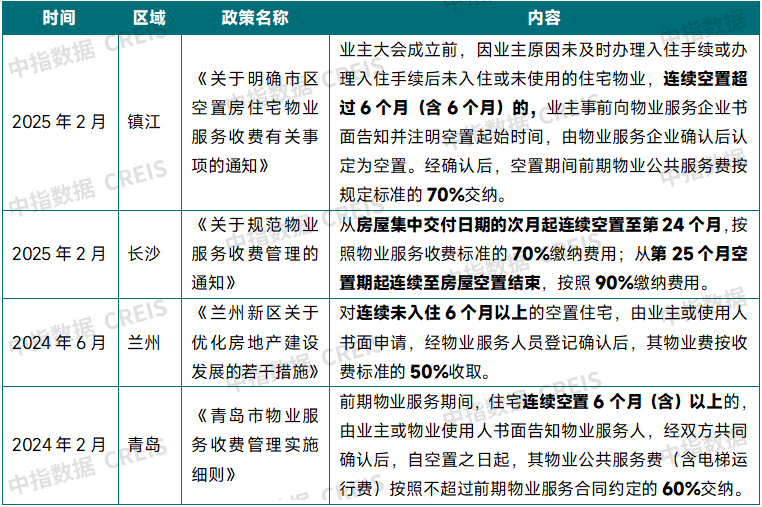 2025年上半年,“空置房物业费减免”成为部分城市物业政策的关注对象。2025年2月,江苏镇江宣布连续空置超过6个月的住房,可申请享受物业费七折优惠。同月,长沙市宣布空置房物业服务费实行阶梯式优惠。2024年以来,山东青岛、甘肃兰州等地也明确连续空置6个月以上的房屋物业费打折。