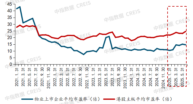 图:2021年年初-2025年6月24日收盘港股物企PE均值走势
