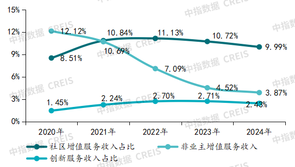 从百强数据看,2020年,百强企业非业主增值服务收入占比约为12.12%,到2024年已下降到3.86%,近几年呈现快速而持续的下跌趋势。非业主增值服务依赖于开发商的新房开发及销售活动,在增量市场转入存量市场的背景下,这种变化趋势是不可逆的。