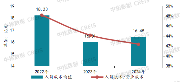 从人力成本优化的成效来看,2024年物业服务上市公司的人员成本均值为16.45亿元,较上一年微增0.44亿元;虽然人员成本均值增加,但其增速小于营业成本均值的增速,人员成本占总营业成本的比例下降,2024年为42.36%,较上一年减少1.82个百分点,物业企业的人力成本控制策略已初见成效。