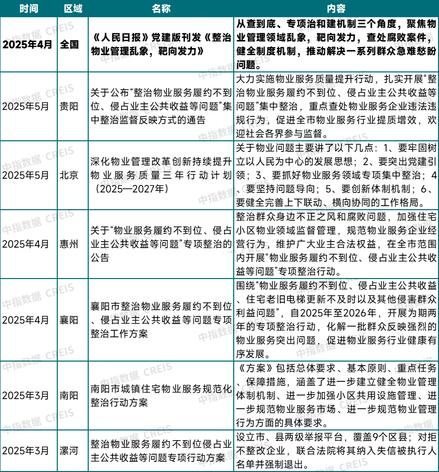 完善法制建设与监督机制有助于进一步明确各地物业管理市场所面临的具体问题,从而开展针对性的整治行动,并且使行动做到有据可依,使行业做到有标可循。2025年上半年,全国多地发文开展专项整治物业乱象的活动,关注点包括物业服务履约不到位、侵占业主公共收益、停车位和住宅老旧电梯更新不及时以及物业费定价等群众反映的问题。