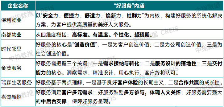 然而,对于“好服务”的具体内涵,目前政策层面的解释相对有限,且基本停留在服务内容方面,有待后续进一步出台规范性文件。截至目前,“好服务”的具体标准通常由各物业企业自行制定,每家物业公司都在探寻“好服务”的定义,每个物业人对“好服务”都有不同的解读。整体看,“好服务”主要聚焦以下几个维度:一是客户需求和体验,如保利物业的好服务中安全力、便捷力、舒适力都是从客户的服务体验来阐释的;二是服务本身的竞争力,如高标准的服务、价值创造以及好的服务设计,则是强调了好服务本身必须具备的硬实力;三是多方参与、合作共赢,通过好服务构建良好的社区生态,形成美好、和谐的人文环境。