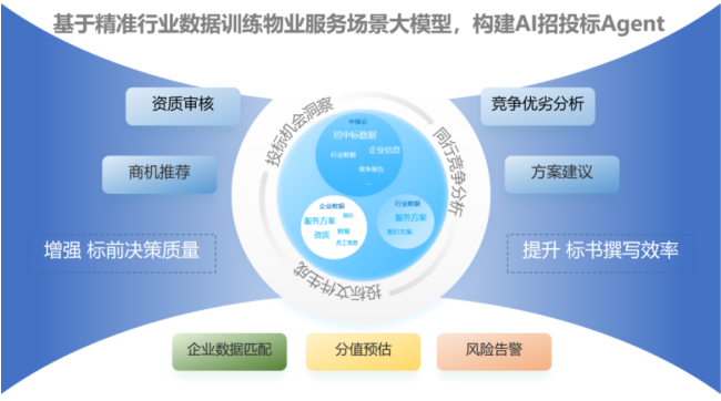 AI招投标Agent能够基于中指研究院海量行业数据积累与AI大模型深度学习技术,创新研发物业服务领域垂直大模型,通过AI与行业经验的深度耦合,为企业构建覆盖投标全周期的智能决策体系,推动招投标流程向数智化方向演进。该产品核心突破在于打造具备专业认知能力的AI招投标智能体。通过吸收数十年行业专家沉淀的标书编制经验,从市场中高效匹配海量投标信息,实时匹配优势项目源,AI协助3分钟完成撰写,并覆盖所有评分要点,能够像资深投标顾问般理解并完成70%招标文件撰写,更多的解放人工冗余工作,投入30%即可完美满足招标要求。AI招投标Agent在商机挖掘环节,智能引擎可实时追踪各地招标动态,自动筛选高契合度商机并生成定制化投标建议。帮助企业5倍提升投标数量,3倍提升中标率,企业得以在投标效率、方案质量、成本控制等方面形成复合竞争优势,在存量市场竞争中建立差异化的服务能力壁垒。