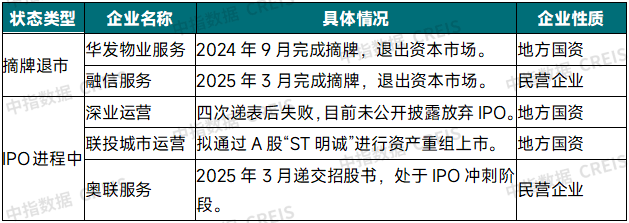 值得注意的是,资本市场也出现了已上市的物业公司基于自身战略选择,主动退出资本市场的现象。2025年2月17日,融信服务控股股东融心一品有限公司提出的私有化建议,获法院会议及股东特别大会批准。2025年3月18日,融信服务正式完成了私有化流程,退出资本市场,成为第二家主动从港股主板退市的物业企业。