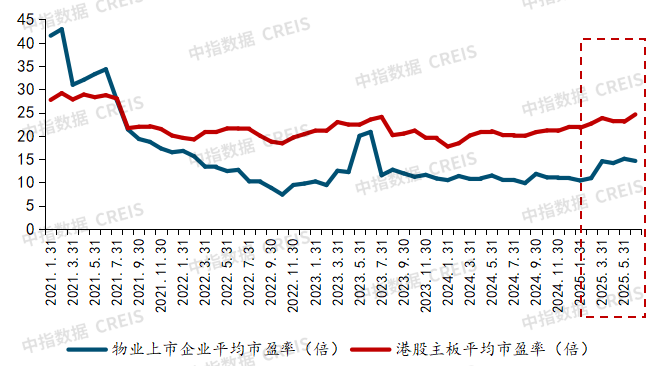 图:2021年年初-2025年6月24日收盘港股物企PE均值走势