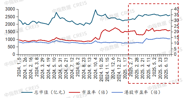 2025年上半年,港股与A股物业板块走势略有企稳,受政治局会议首次提出“房地产市场止跌回稳”的目标的影响,以及两会政策利好和消费回暖预期推动,总体上呈现稳中有升的态势。截至2025年6月24日,行业共有67家上市公司,其中香港主板61家,A股6家,上市公司总市值约为2598.21亿元,PE均值为21.18倍(剔除负值及大于500倍的异常值),均较去年同期有所回暖。