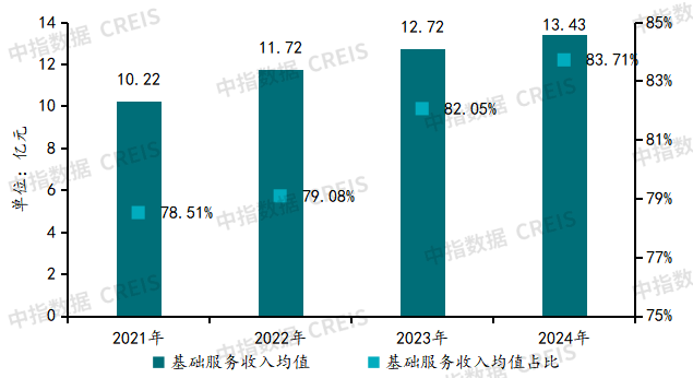 近年来,随着房地产市场下行,物业公司的业务结构发生显著变化,突出表现为基础服务在整体业务中的占比持续提升。2024年,百强企业基础服务收入均值为13.43亿元,在营业收入中的占比为83.71%,同比提升1.66个百分点,且近几年该占比连续保持增长,基础服务的压舱石作用显著。