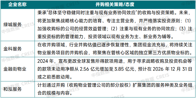 并购市场更趋理性,但仍有机会。第一,在存量市场下,关联方赋能不断减弱,市场拓展竞争激烈,部分物业公司仍然在关注优质的并购标的。绿城服务在并购投资方面将更加聚焦战略核心能力的培育、专注主营业务,并严格落实投资原则。第二,经过近几年资本市场的调整,物业公司的估值逐步回归理性,优质资产仍具备投资价值。金科服务认为在收并购领域,行业并购估值已逐步恢复理性,集团现金流充裕,将持续关注物业服务项目的并购机会,将聚焦在管核心区域的独立第三方优质物业标的。第三,国家层面发布相关政策支持公司间并购重组和资源整合。2025年5月16日,证监会发布【第230号令】《关于修改<上市公司重大资产重组管理办法>的决定》,有利于各项措施全面落地,进一步释放市场活力。此外,随着国企改革提升行动的深入实施,地方国企资源整合迎来机遇期。