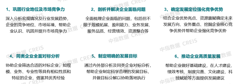 展望“十五五”期间,挑战与机遇并存。物业企业可能持续面临规模增长乏力、盈利水平下行等压力,也将迎来数字化转型、社区经济升级、相关政策支持等多重发展机遇。开展“十五五”战略规划,将有利于物业企业进一步明确发展战略、发展目标与发展路径。中指研究院作为一家独立的第三方机构,能够更全面、更深刻地认识行业发展情况和竞对情况,可以在以下六个方面为企业的“十五五”规划赋能,助力物业企业的“十五五”规划撰写与落地: