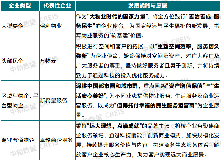 而从长期发展战略与愿景来看,物业企业基于自身企业背景、企业规模、资源禀赋的差异,各自选择了不同的业务方向作为企业的战略聚焦点。保利物业是大型央企的代表,作为“大物业时代的国家力量”,全方位践行“善治善成 服务民生”的企业使命,为国家经济与民生福祉的新发展,书写物业服务的“软基建”价值。万物云作为重视空间与科技的头部民营物业企业,积极进行空间和客户的拓展,以“重塑空间效率,服务历久弥新”为企业使命,始终保持对空间及资产、对广大客户及广大服务者的尊重,坚持做好服务者且勇于创新,并将持续致力于通过科技的投入优化服务能力。新希望服务深耕中国都市圈和城市群,是四川本土港股上市的区域型物企代表,且背靠世界500强企业新希望集团,具有得天独厚的品牌优势与民生产业供应链优势,具备平台型物业企业的特征,其重点围绕“资产增值保值”与“生活安心美好”,为不同业态提供物业服务、生活服务及商业运营服务,以成为“值得托付幸福的民生服务运营商”为企业愿景。卓越商企服务则重点聚焦专业赛道,秉持“远大理想,点滴成就”的品牌主张,将核心业务聚焦商企服务领域,通过科技赋能、创新商业模式,加快规模化发展,持续提升服务价值与内容,构建商务生态服务体系,解放客户企业核心生产力,助力客户实现远大商业愿景。