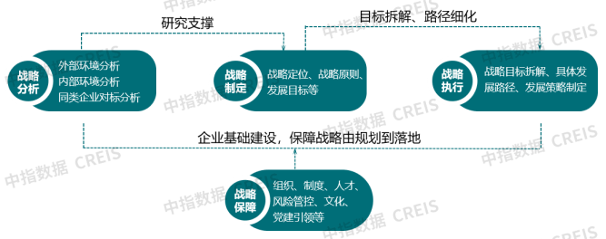 在规划的研究思路方面,中指研究院通过对行业外部环境、企业内部环境以及同类企业对标案例的战略分析,来支撑企业的战略定位、战略原则、发展目标等战略内容的制定,并通过目标拆解与路径细化以推动战略执行,并构建相应的保障措施,以确保企业的战略规划能够顺利落地。