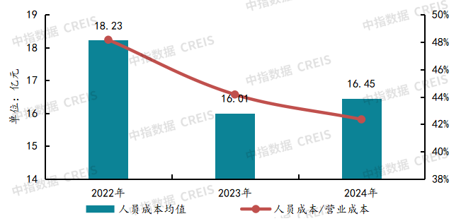 从人力成本优化的成效来看,2024年物业服务上市公司的人员成本均值为16.45亿元,较上一年微增0.44亿元;虽然人员成本均值增加,但其增速小于营业成本均值的增速,人员成本占总营业成本的比例下降,2024年为42.36%,较上一年减少1.82个百分点,物业企业的人力成本控制策略已初见成效。