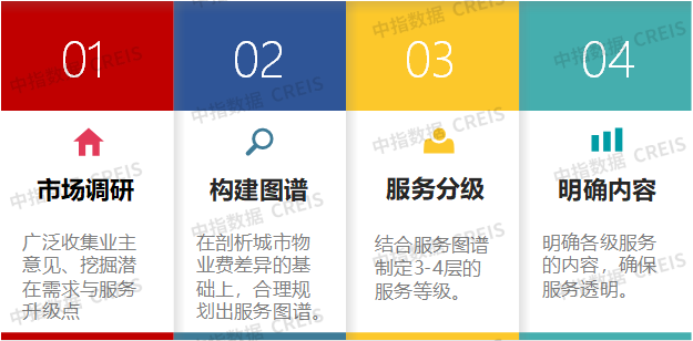 行业标杆企业在搭建分级服务体系框架的过程中,基本遵循了四个步骤:首先,开展市场调研,明确客户对品质服务需求的最大公约数,并挖掘客户潜在的服务需求及服务升级点;其次,从市场真实需求出发,明确企业服务方向,并在全面剖析城市物业收费水平差异的基础上,可以结合服务业态和服务场景合理规划服务图谱;再次,结合各类服务图谱分别制定3-4层的服务等级,通常情况下,物业收费价格越高的城市,属地项目同等级服务应该匹配的服务内容越多;最后,企业应从突出服务特色与优势的角度,打造差异化服务策略,同时要明确各级服务内容,并确保服务透明化,为业主提供清晰、可预期的服务体验。