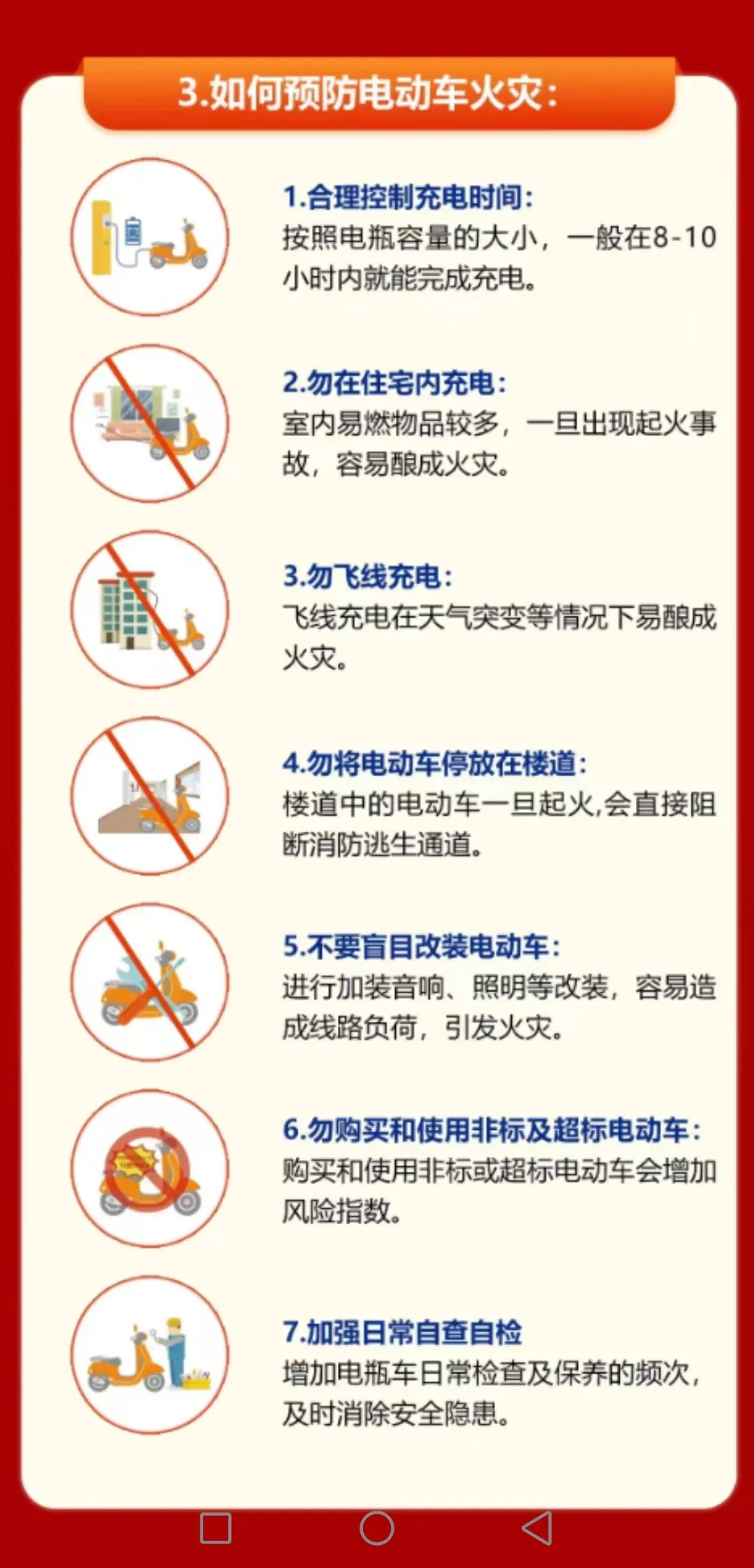 《高层民用建筑消防安全管理规定》第三十七条:禁止在高层民用建筑公共门厅、疏散走道、楼梯间、安全出口停放电动自行车或者为电动自行车充电。违反此规定的,由消防救援机构责令改正,对非经营性单位和个人处500元以上1000元以下罚款。